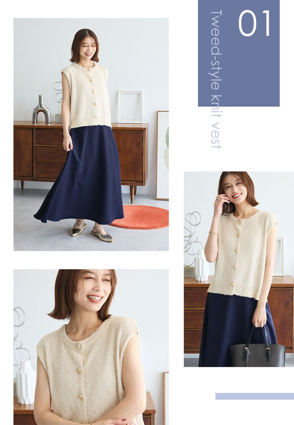 秋を感じられるツイードライクなニットベスト。ノースリーブのプルオーバー風で着用すれば、暑い日にもぴったりなスタイリングに。深みのあるネイビーのスカートで上品にまとめて。
