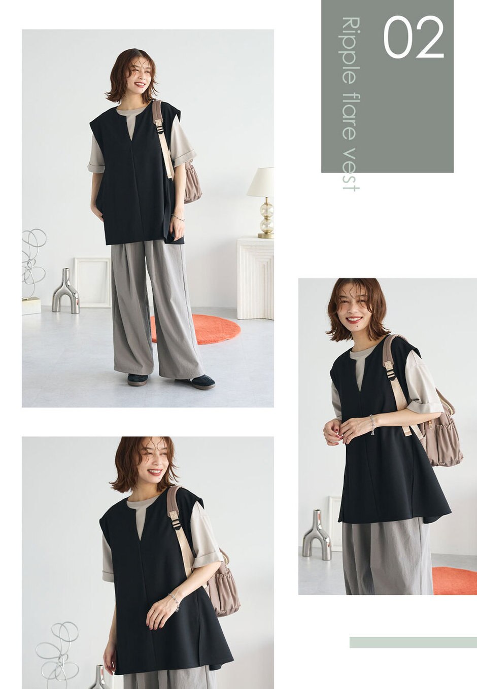 いつものTシャツの上に取り入れるだけでコーデを格上げしてくれるフレアベスト。さらっとしたリップル素材でこの時季のレイヤードに最適なアイテムです◎リュックやスニーカーを取り入れたアクティブさのあるスタイルも大人っぽく着こなせます。