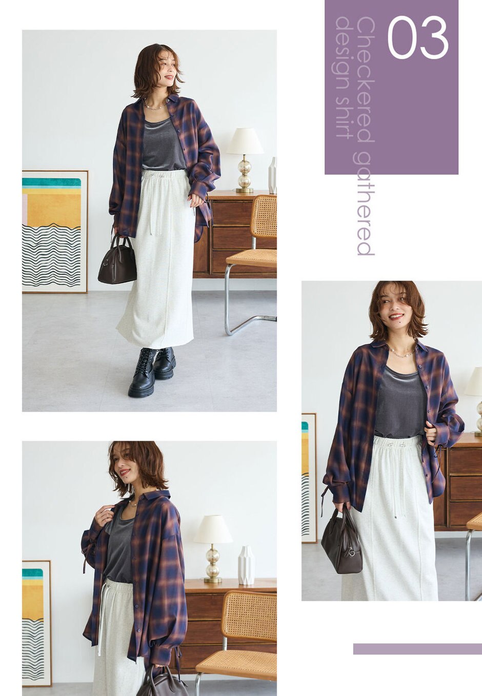 秋といえば深みのあるカラーのチェック柄シャツ!ゆとりのあるサイズ感とタンクトップ合わせで風通しがよく涼しく着られます。いつもならスニーカーを合わせるスタイルも、ショートブーツに変えることでよりシーズンムードが高まります◎