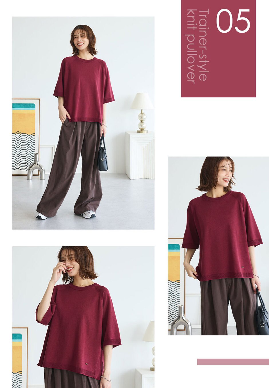 Tシャツに飽きた!という方におすすめしたいのがこのニットプルオーバー。トレーナーのようにさらっとラフに着られるデザインが魅力◎風通しのいいボックスシルエットで今の時季から楽しめます。深みのあるレッド×ブラウンでカラーでも秋を取り入れて。