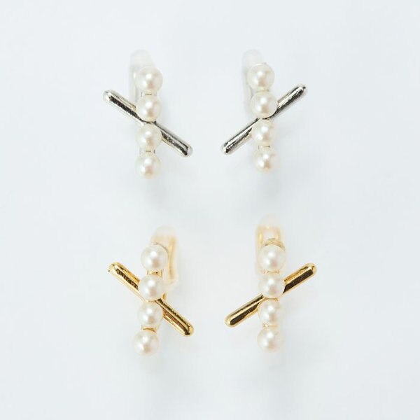 繊細なメタルラインとパールがクロスしたイヤリング。