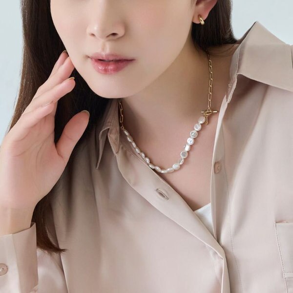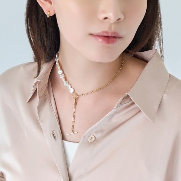 フラットな形状のボタンパールが上品なアクセントになり、Tシャツやシャツにプラスするだけで“高見え”するこなれたスタイリングに。