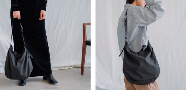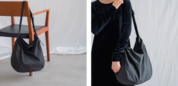 ナイロンの軽やかさと、レザーの凛とした表情。ほんのりドレープを効かせたフォルムは、甘くなりすぎず、柔らかく品のある佇まいに。