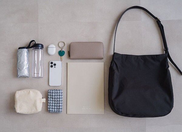 ・A4ノート・500mlボトル・折り畳み傘・長財布・ポーチ・ハンカチ・イヤホン・iphone・鍵