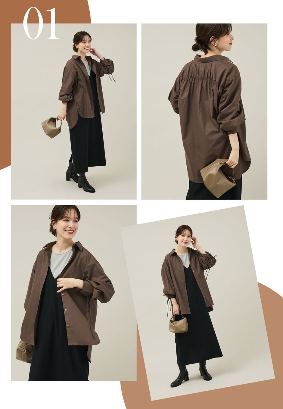 まだ暑さの残る日でも取り入れられるシャツ羽織りスタイル。ブラウンのシャツだと秋らしさも増して◎シンプルなスタイルに華やかさを添える袖シャーリングシャツは、1枚持っているとこれからの時季重宝します!