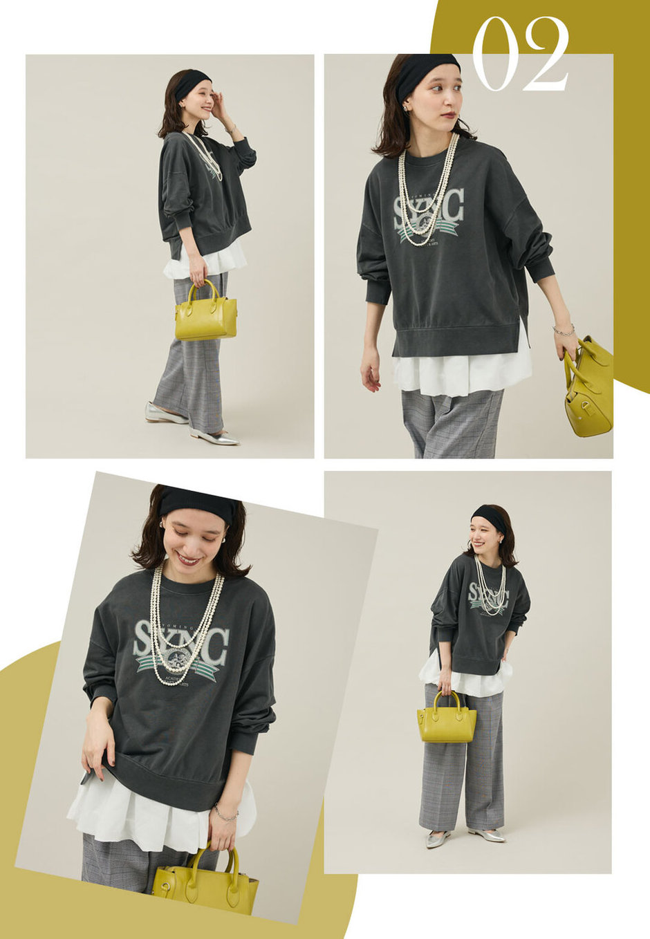 インナーも長袖だと暑い…という方におすすめなのが、裾にデザインを施したタンクトップとのレイヤード。今季Green Parksで注目のロゴスウェットとも相性抜群です!チェック柄のパンツを合わせたシーズンムード高まるスタイルで。