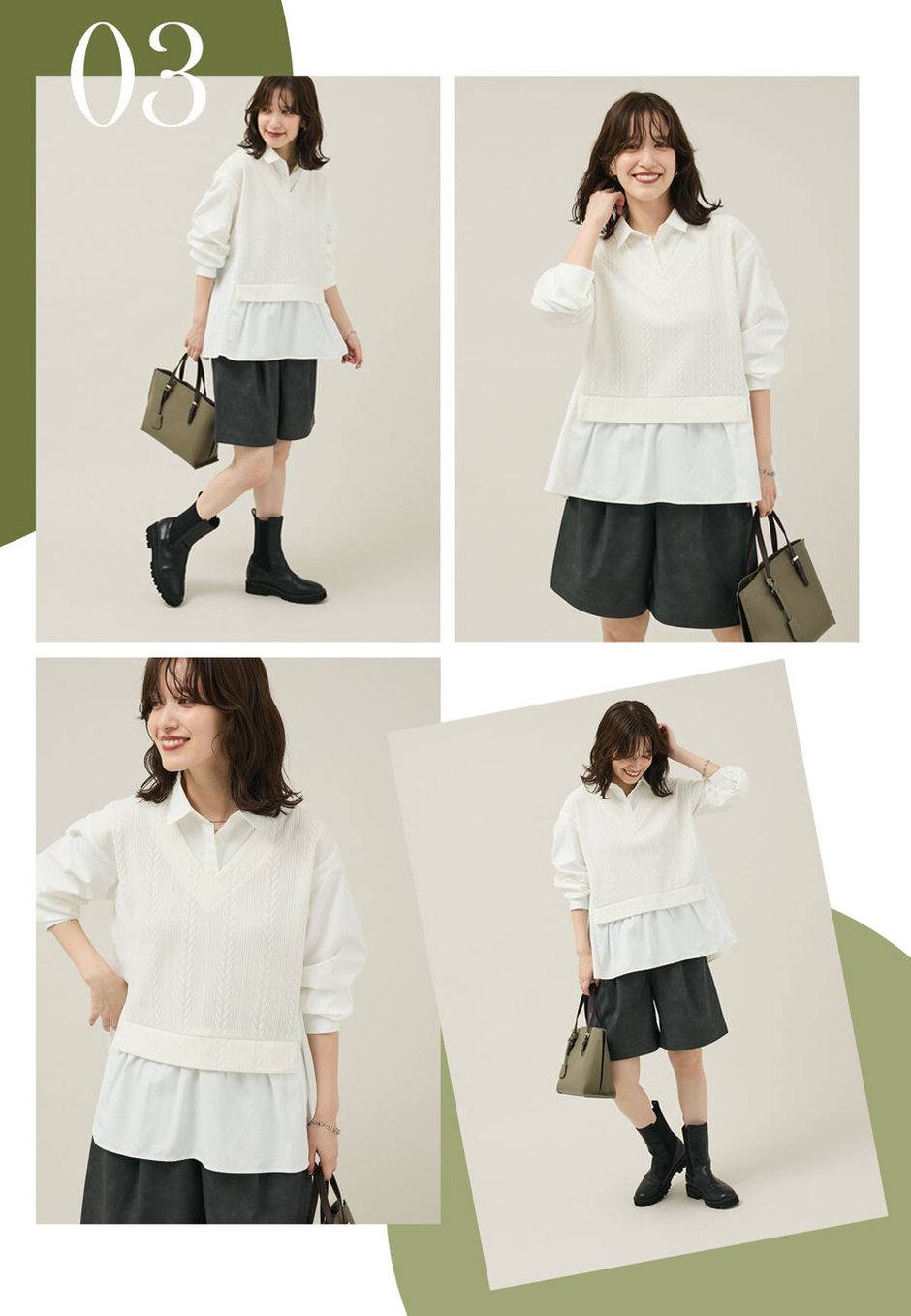 1枚でレイヤードスタイルが叶う、ベストがドッキングされたシャツ。スタイリッシュなデザインでハーフパンツスタイルも大人っぽく決まります。ニュアンスカラーのフェイクレザーパンツがこなれ感をプラスしてくれます。