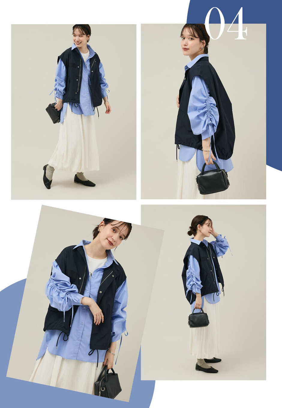 レイヤードがお好きな方におすすめしたい、ちょっぴり上級者なレイヤードスタイル。メンズライクなミリタリーベストは、シャーリングシャツやバルーンスカートと合わせると女性らしい着こなしに。足元を上品なパンプスにしたのもポイントです。