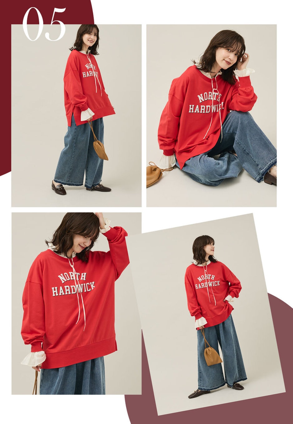 スウェット×デニムのコーデはラフな印象になりがち…フリルブラウスを覗かせることで大人の余裕感じるカジュアルスタイルに。小物もブラウン系を選ぶことで上品にまとまります。