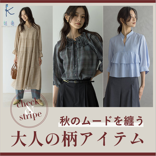 シンプルな夏服から一転、秋は華やかな柄アイテムで存在感をアップ。