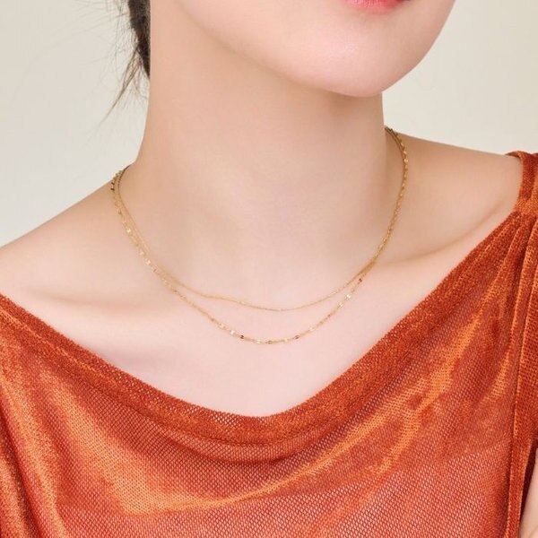 異なるデザインのチェーンが絶妙なバランスで重なり、首元に上品でオシャレなニュアンスをプラス。
