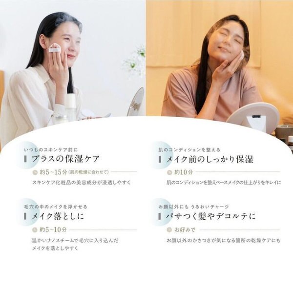 温ナノミストでうるおい上手な肌へ。FESTINOのナノミストは肌の奥までしっかり潤いを届ける極微細なナノサイズ。1/1,000,000mmのとても細かいミストは角質層にまでうるおいが浸透。さらに約45℃の温かいミストで肌を柔らかくしながら保湿することで、肌のめぐりを整え、肌の土台を底上げ。季節の変わり目や紫外線、空調などに負けない、ポジティブな肌へ導きます。