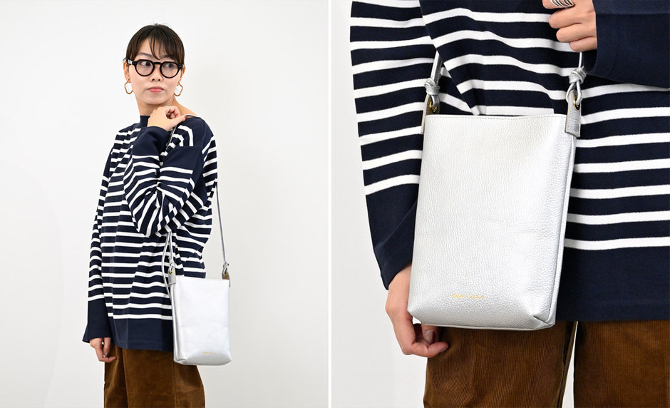 Hekher Le Style de Vie<キャス1024> スマートな印象のスクエアショルダーに、新色シルバーが加わりました。薄マチで軽やかに持てるのに、必要な荷物はしっかり入る実力派。シュリンクレザーだから傷や汚れに強く、ちょっとした雨もさっと拭くだけで安心です。ショルダーの長さ調整で、気分に合わせた持ち方が楽しめます。