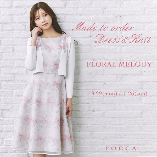 9/29(mon)~10/26(sun)単色小花をリボンで結んで、音符をイメージした繊細な表現の刺繍ドレスと、