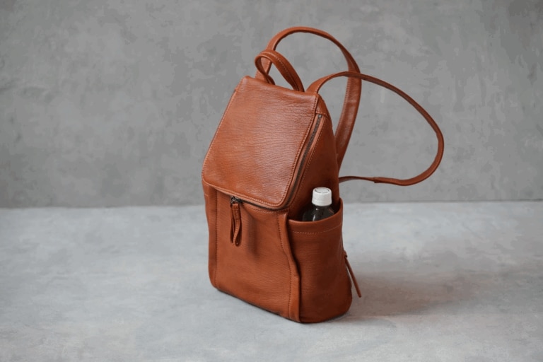 さらにサイドポケットにはペットボトルや折り畳み傘を収められます。収納した際に革がわずかに内側に凹むため、外に飛び出すことなくすっきり収まり、背負ったときのシルエットを損なわない設計です。