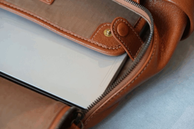 メイン収納には、A4サイズの書類や13インチのノートPCが収まります。ファスナーの幅はあえてA4よりも少し狭く設計されていますが、山羊革のしなやかな柔軟性があるため問題なく収納可能です。革が自然に馴染んでふくらみを受け止めることで、寸法上では想像できない実用性を発揮。必要な荷物をしっかりと収めながら、外観は無駄のないシャープさを保ちます。