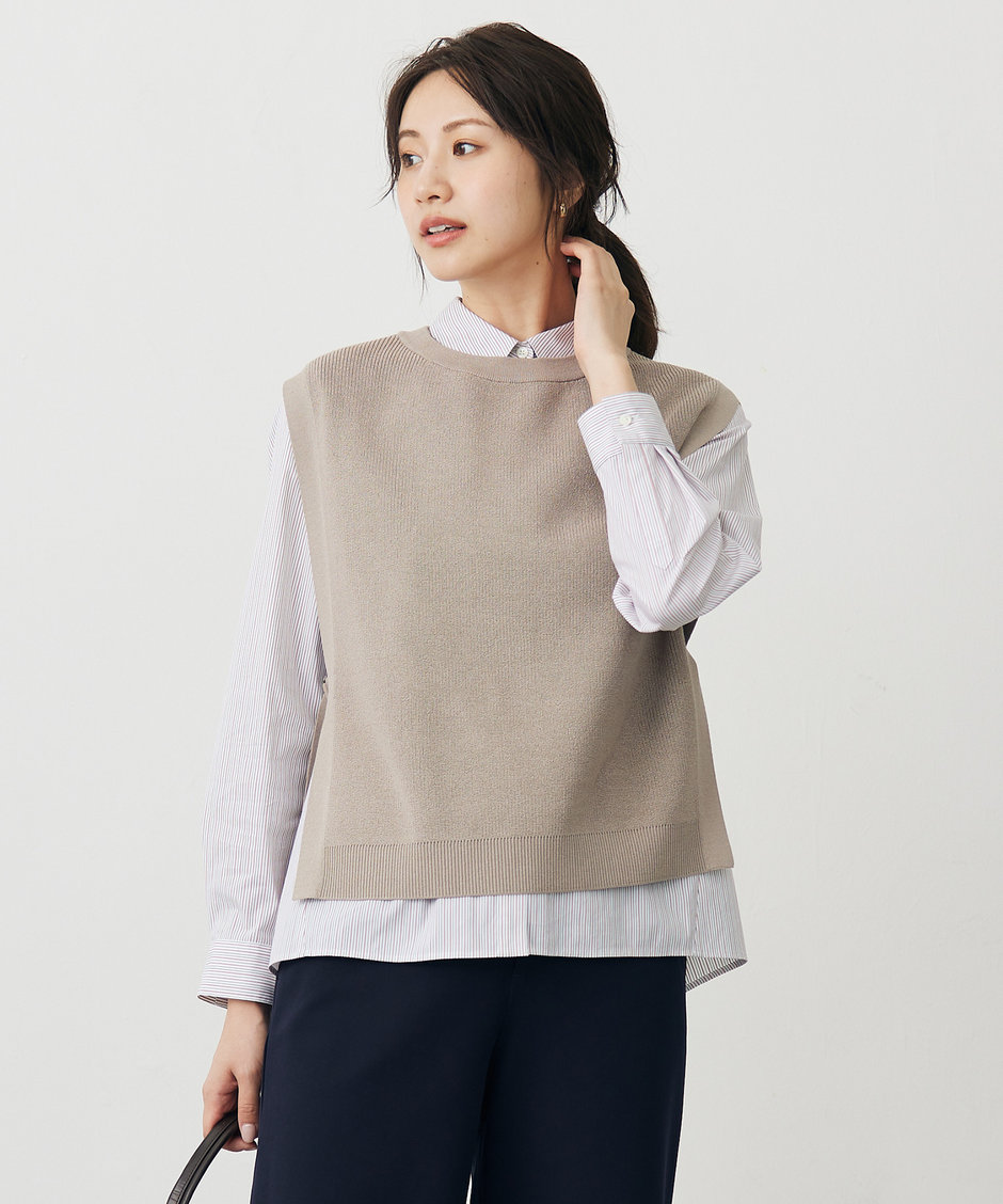 スタイリングのポイントになる、片畦編みのベスト。さらりとした肌触りと清涼感のある表面感が特徴の素材を使用、今の時期から着用するのにちょうどよい軽さです。脇下はベルト留めつきですっきりと開いたシルエット。ブラウスやカットソーなどとも相性が良く、端境期にあると頼れるアイテム。