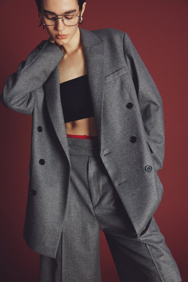 品のある素材で仕立てたビッグシルエットジャケットに、旬なフレアシルエットパンツはイチオシのセットアップ。