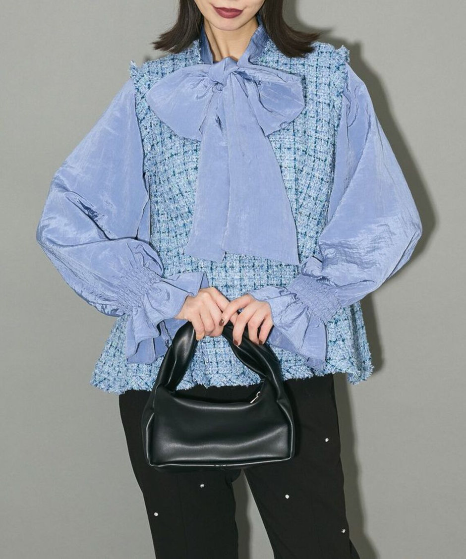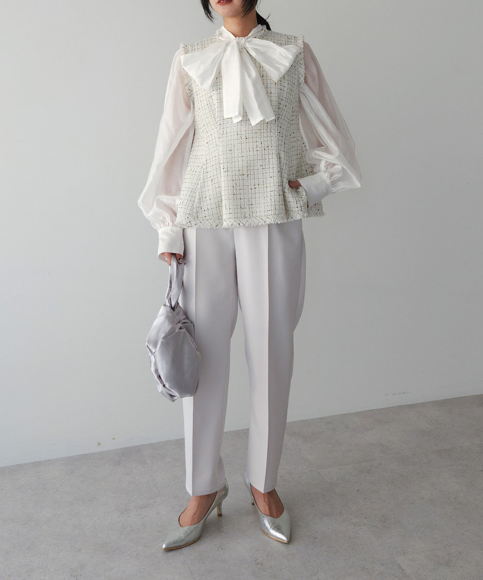 ボウタイブラウスとペプラムベストの相性が抜群◎