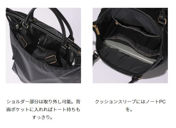 シンセティックレザーハンドルの薄マチトート。ノートPCやA4サイズの資料もすっきり収納でき、お仕事時にも活躍します。他のバッグとの2個持ちもおすすめ。