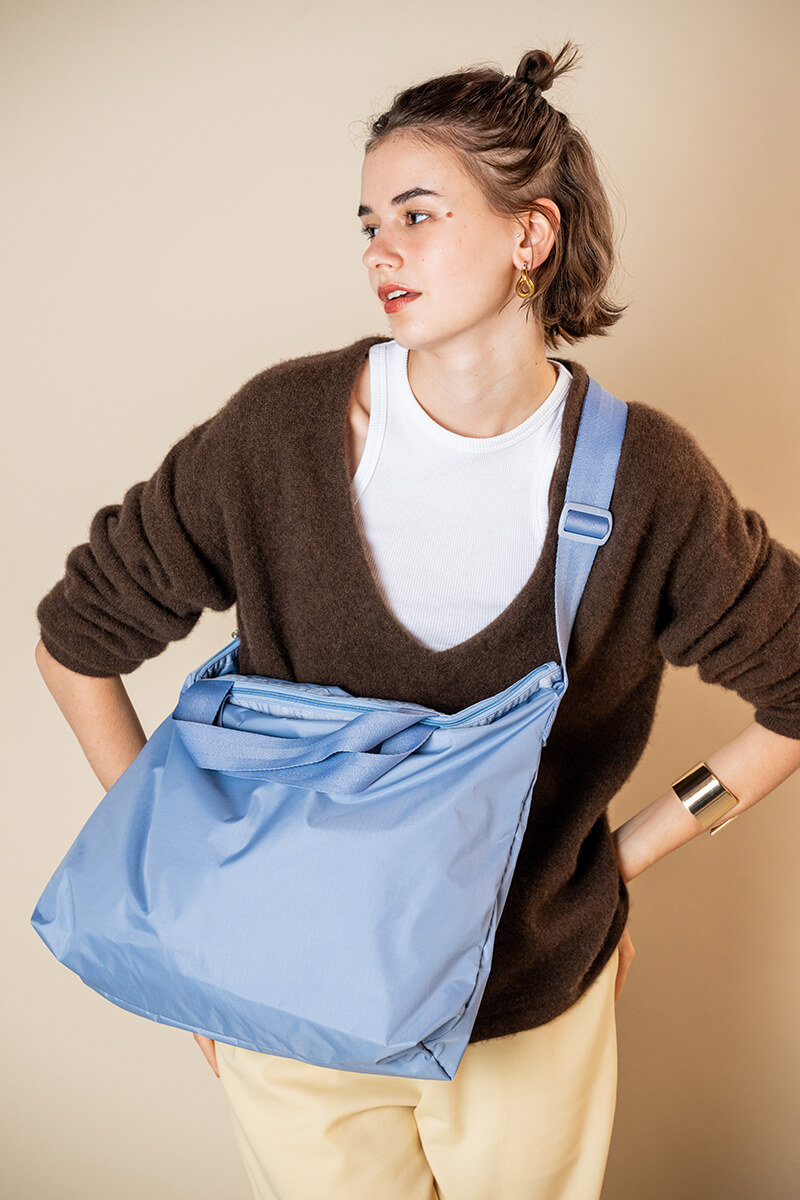 ショルダー付きのバケットバッグは、手持ち、肩掛け、クロスボディでお持ちいただけます。