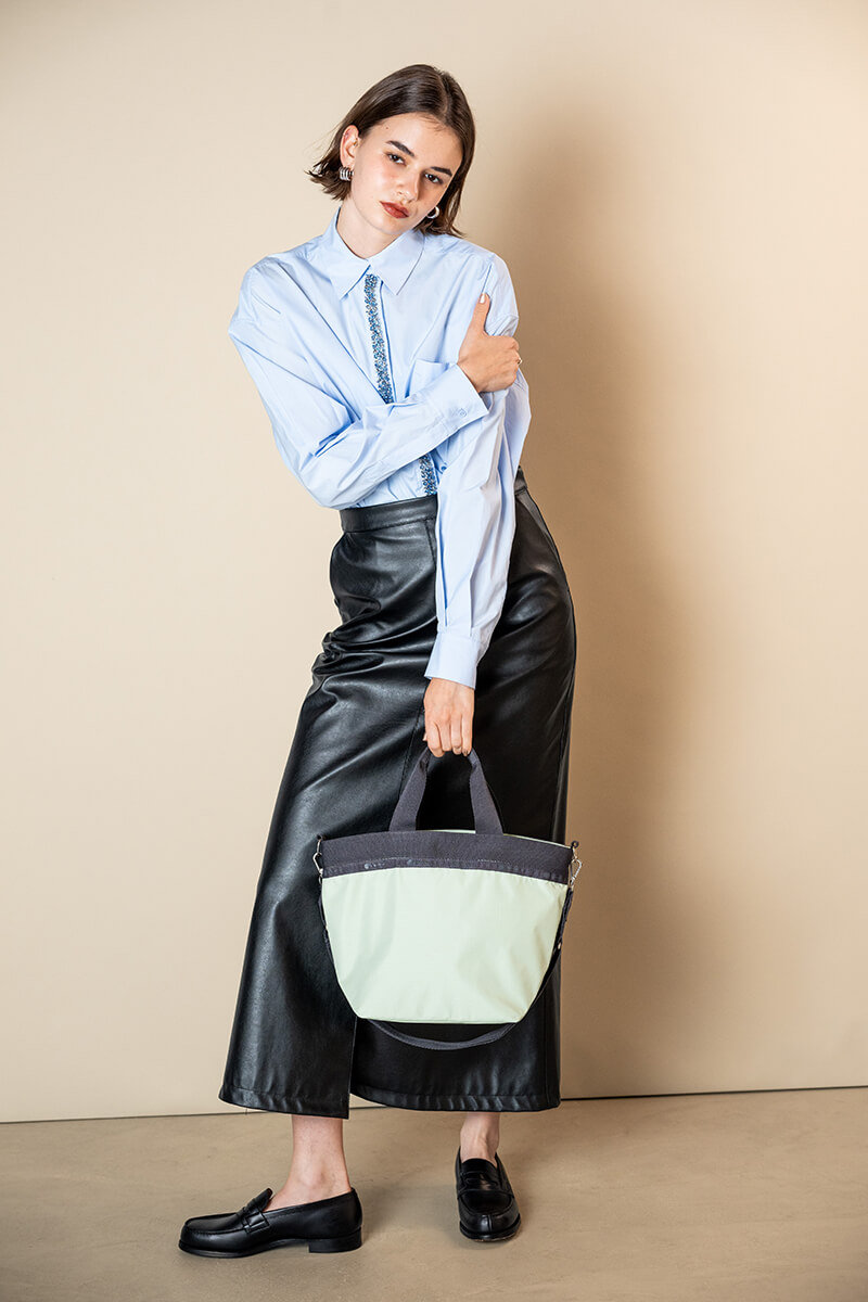 爽やかなペールグリーンとグレーのバイカラー。B5サイズの舟形トートはお仕事コーデにもおすすめ。