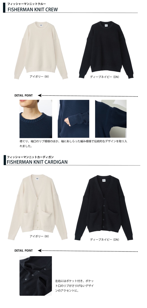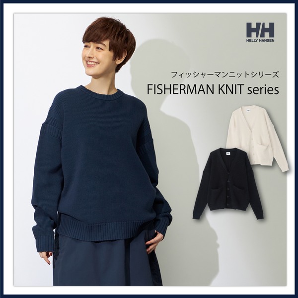 漁師たちが海に出る際に着用していた「ガンジーセーター」をルーツに、ヘリーハンセンが現代的な素材とデザインで再構築した「フィッシャーマンニットシリーズ」が登場。オーガニックコットンとリサイクルポリエステルを使用した肉厚な片畦編みは、ナチュラルな風合いと軽やかな着心地を両立。袖に施された編み模様が、伝統の息吹を感じさせます。