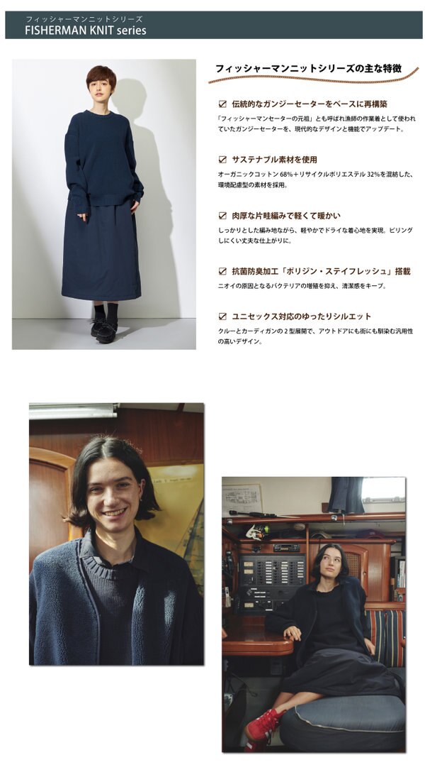 ラインナップは、すっきりとしたシルエットの「フィッシャーマンニットクルー」と、羽織りやすくスタイリングの幅が広がる「フィッシャーマンニットカーディガン」の2型。どちらも抗菌防臭加工「ポリジン・ステイフレッシュ」を施し、快適さと清潔感をキープ。環境にも配慮したサステナブルな素材使いで、アウトドアからタウンユースまで活躍する一着です。