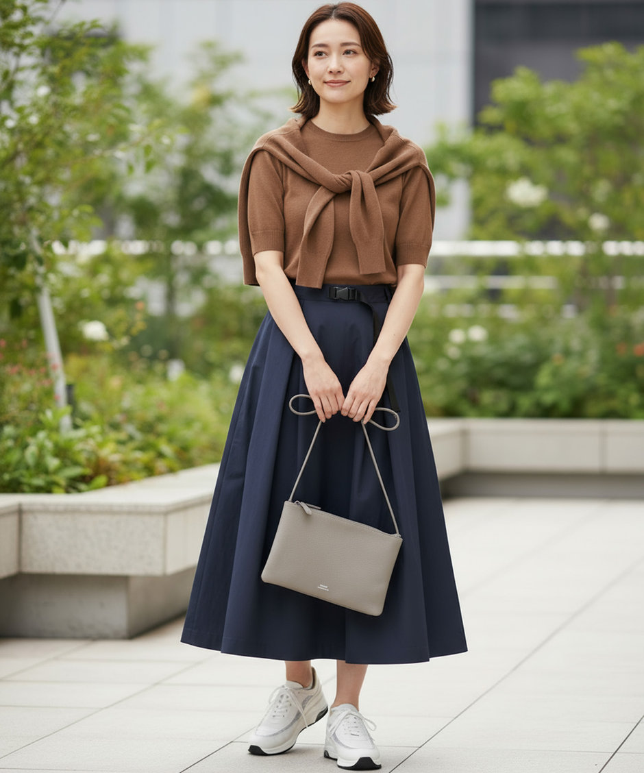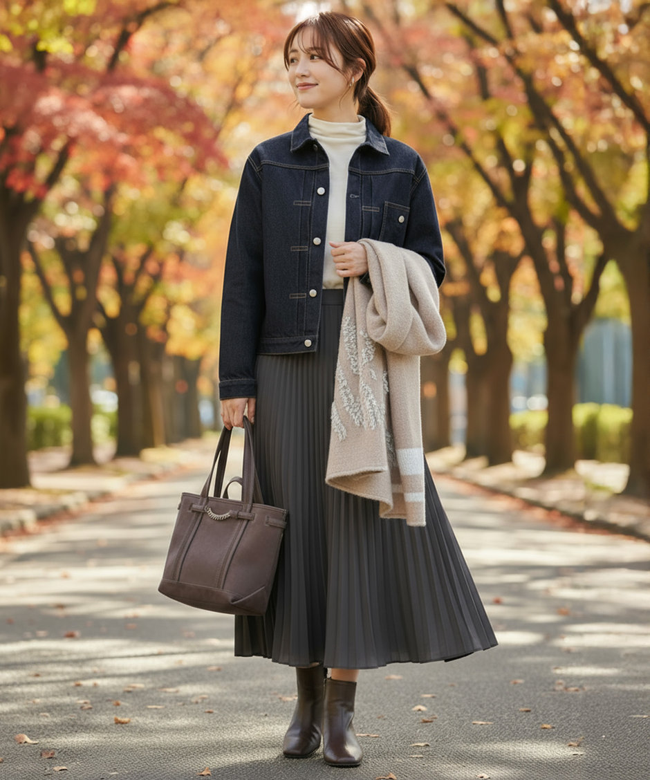 ボトムは、きれいめのデニムやミディスカートで抜け感を出すと、軽快な印象に仕上がります。