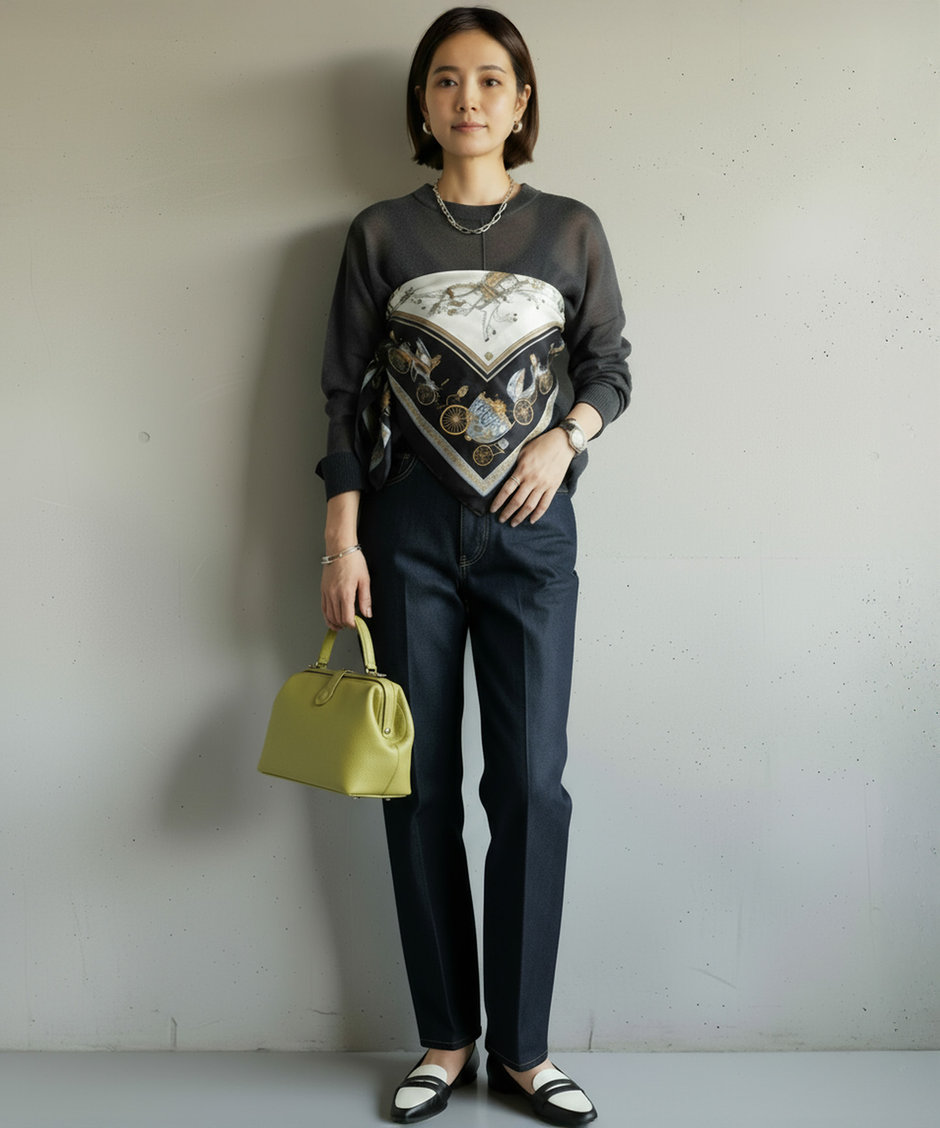 薄手のニットやシャツに軽やかなスカーフを合わせて、程よい季節感を楽しむのがおすすめ。