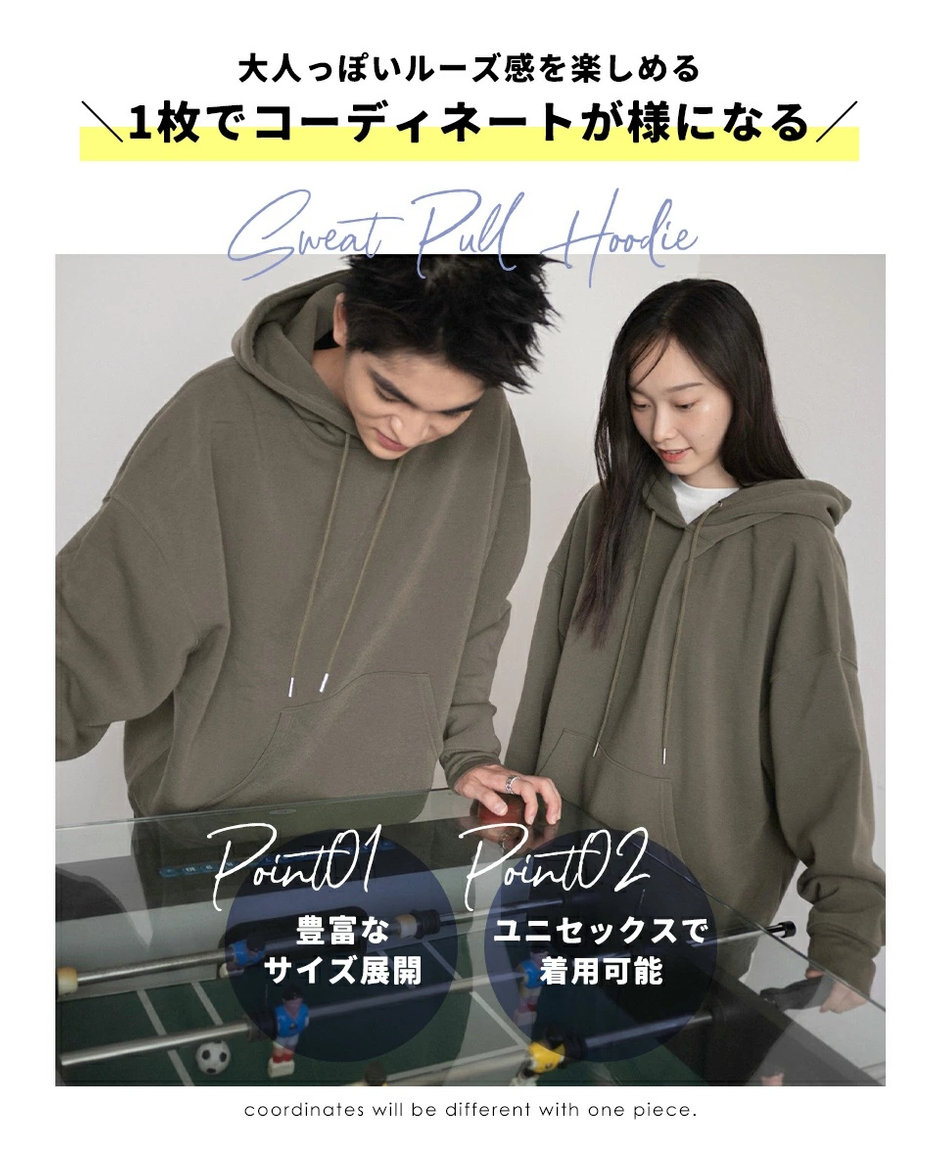 S~XLのサイズ展開で、ペアコーデにもおすすめ。