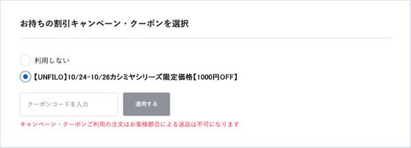 3. お持ちの割引キャンペーン・クーポンの選択欄の【UNFILO】10/24~10/26カシミヤシリーズ限定価格【1000円OFF】を選択し、適用するをクリック。