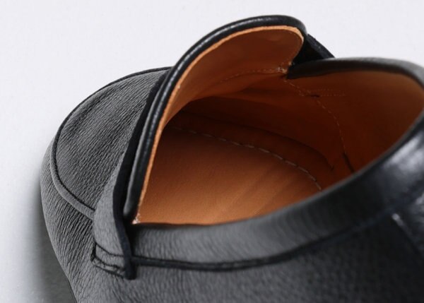 ローファーに多く見られるアッパーの切り口同士を縫い合わせる一般的なモカとは違い、甲のパーツを乗せて縫われた「乗せモカ」のデザイン。