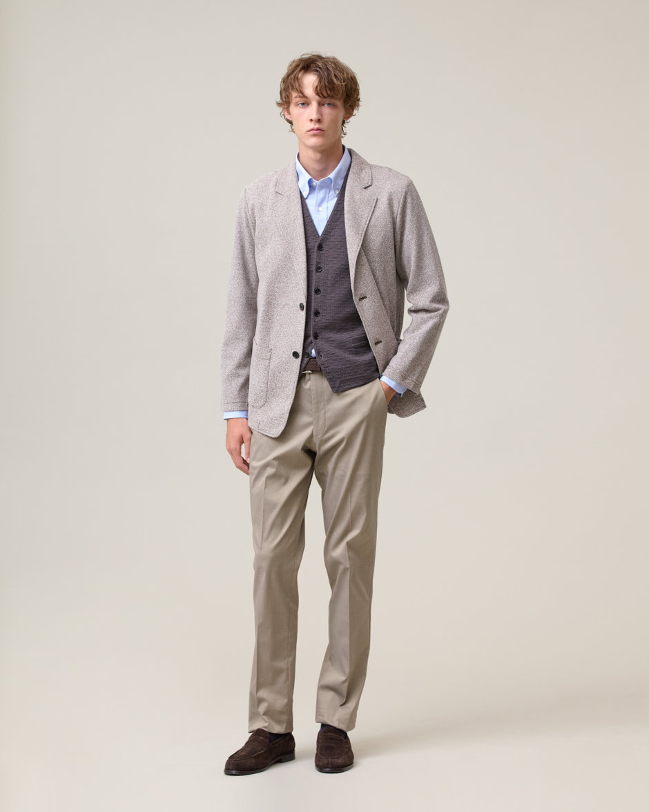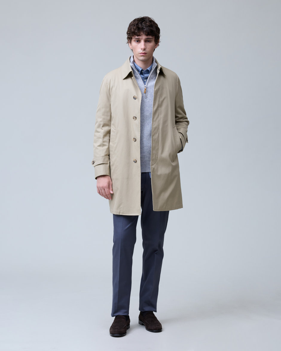 上品なハリと快適なストレッチ性を兼ね備え、気温に合わせた着こなしを自在に楽しめる一枚。