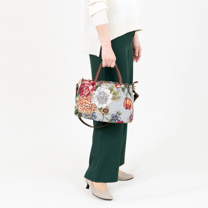 精緻な柄が美しい、スペイン・フラウペレス社のボタニカル柄ゴブラン織りは、厚みがありながら軽やかで、毛羽立ちにくい丈夫さが特長です。ハンドルやショルダーにはレザーを組み合わせ、修理が可能なつくりで長くご愛用いただけます。
