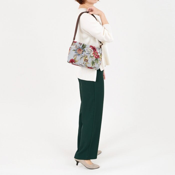 フラワーモチーフを織り込んだデザインが装いに華やぎを添え、日常から旅行まで幅広いシーンで着こなしを明るく彩ります。