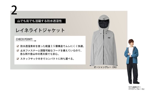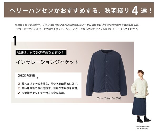 ヘリーハンセンからは、街でもアウトドアでも活躍する機能性とデザイン性を兼ね備えた羽織りアイテムが登場。ミドラーにも最適な中わた入りの「インサレーションジャケット」、アウトドアから街にも馴染む「防水ジャケット」、ふんわり軽くて暖かいボア調の「パイルジャケット」など、秋の端境期に最適なラインアップです。