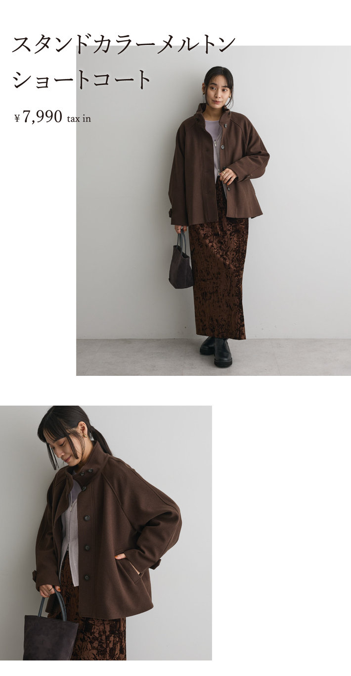 メルトン素材の上品な風合いが魅力のスタンドカラ―ショートコート。