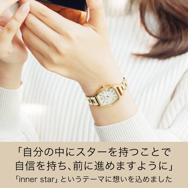 デザインテーマである「inner star」には、「自分の中にスターを持つことで自信を持ち、前に進めますように」という想いを込めています。文字板中央に小さな幾何学形状を組み合わせたチェックのパターンを描き、繊細なきらめきを表現。1、5、7、11時位置に中央からはじけるような形状のインデックスを配置し、軽やかさを演出しています。