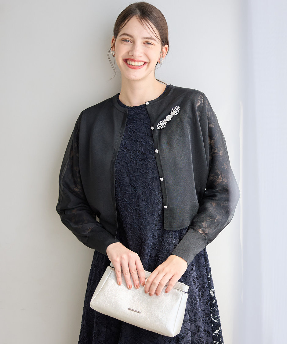 グロッシーな艶感とソフトな透け感のあるカーディガンを羽織ればグっとこなれた印象に。ビジューボタンが華やかなアクセント。