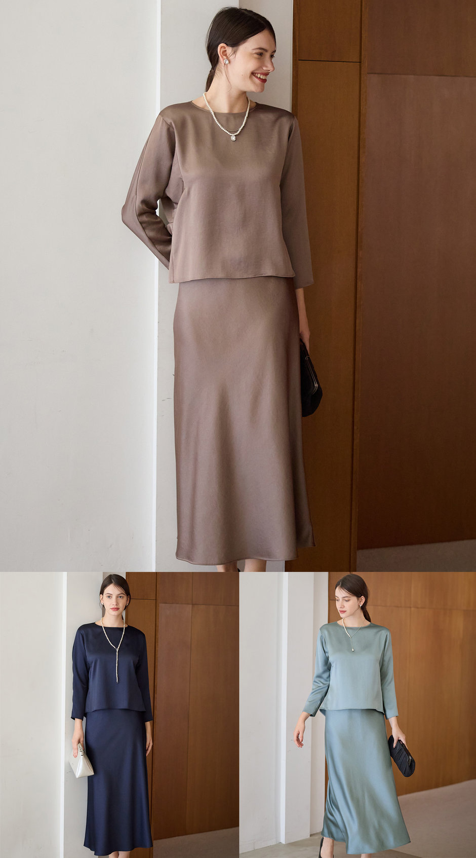 艶めく素材感が魅力のブラウスとスカートのセットは、お仕事やお食事などにも取り入れやすい汎用性の高いアイテム。