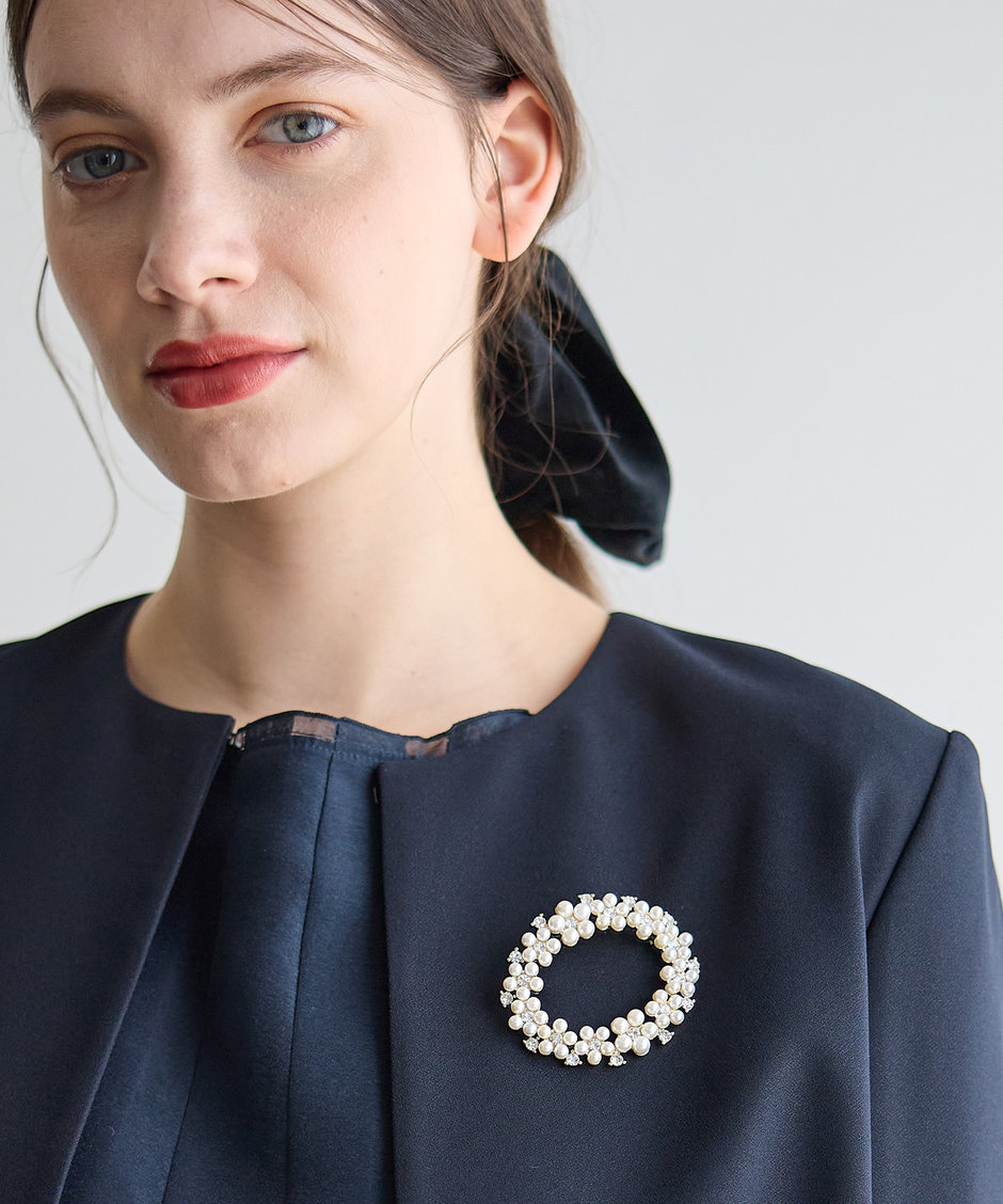 細かなパールにクリスタルが鏤められたブローチ。ドレスや羽織りアイテムの胸元にはもちろんヘアアクセとしても◎