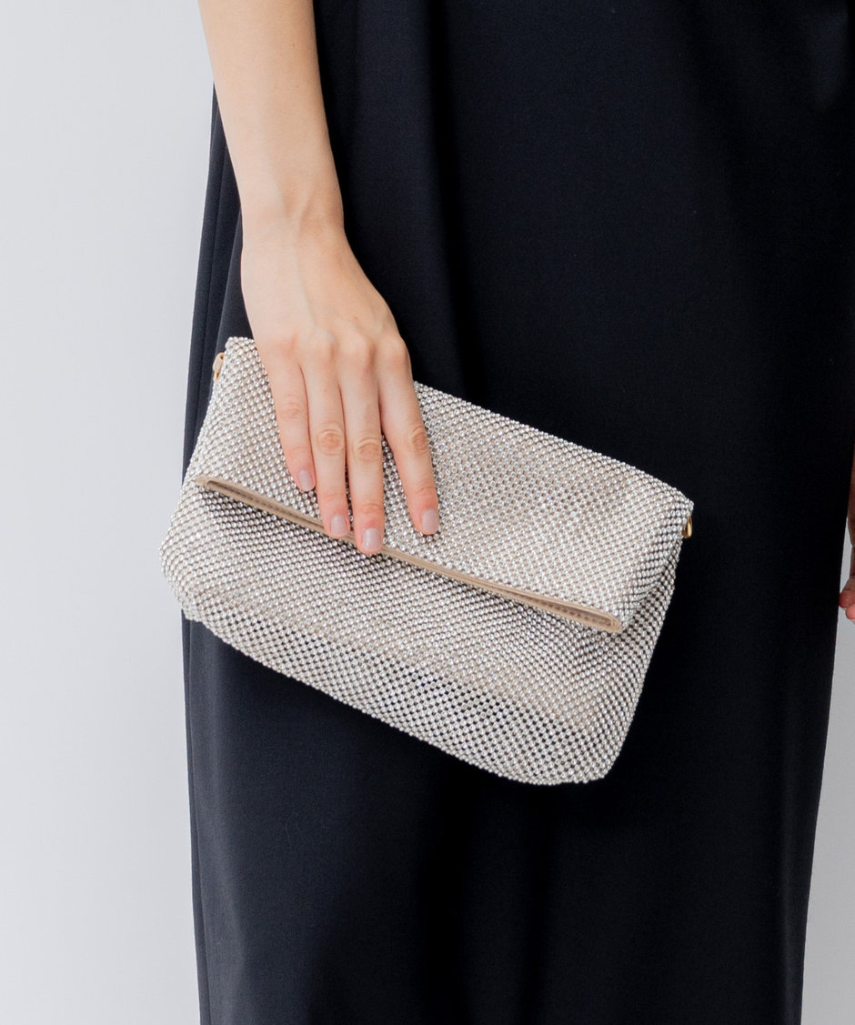 ラインストーンが品よく煌めくパーティーバッグ。二つ折り仕様で開閉しやすく、取り外し可能なチェーンで肩掛けもできる優れもの。