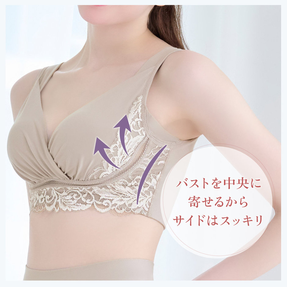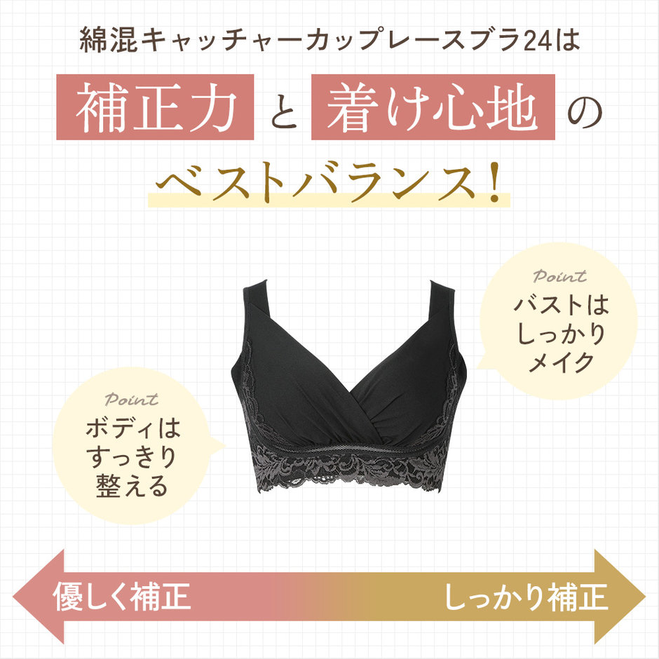 特許取得のバストアップパターンで、しっかりバストを寄せ上げる「綿混キャッチャーカップレースブラ」。
