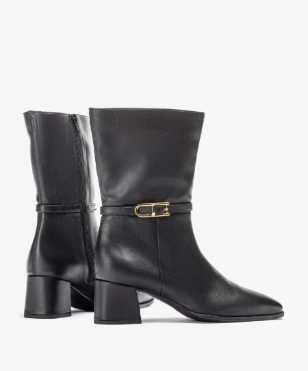 艶やかなブラックレザーに、足首をさりげなく引き締めるゴールドのバックルが上品なアクセント。
