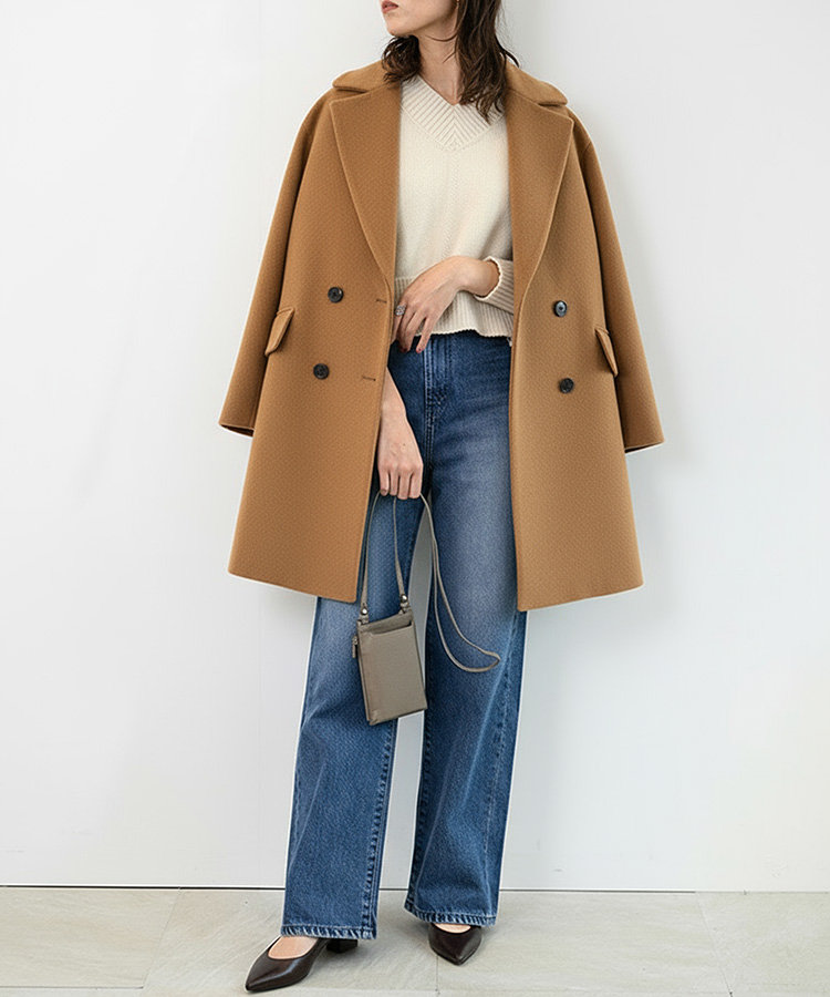 上質なキャメルコート×ブルーデニムの色の組み合わせが相性◎。シンプルないつものスタイリングでもSALUUデニムを穿けばスタイルアップ見えを実現。クリーム色のニットが優しい表情を作り、全体のトーンをまとめつつ華やかさをプラス。シンプルながら洗練されたアクセサリー感覚のグレーバッグが、上品なアクセントになっています。