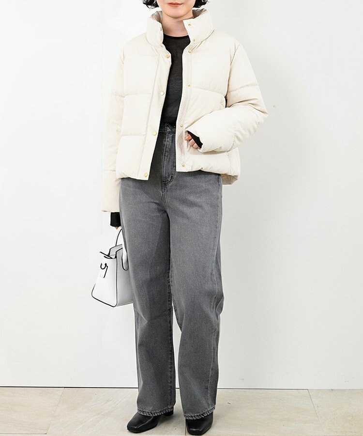 ミニマルな白ダウンとグレーのストレートデニムを軸にした上品な着こなし。モノトーンで統一しつつ、素材感の違いで奥行きを出しているのがポイントに。少し透け感のある黒インナーとシューズで引き締め、白バッグで爽やかさをプラスした、洗練されたシンプルモダンスタイルです。