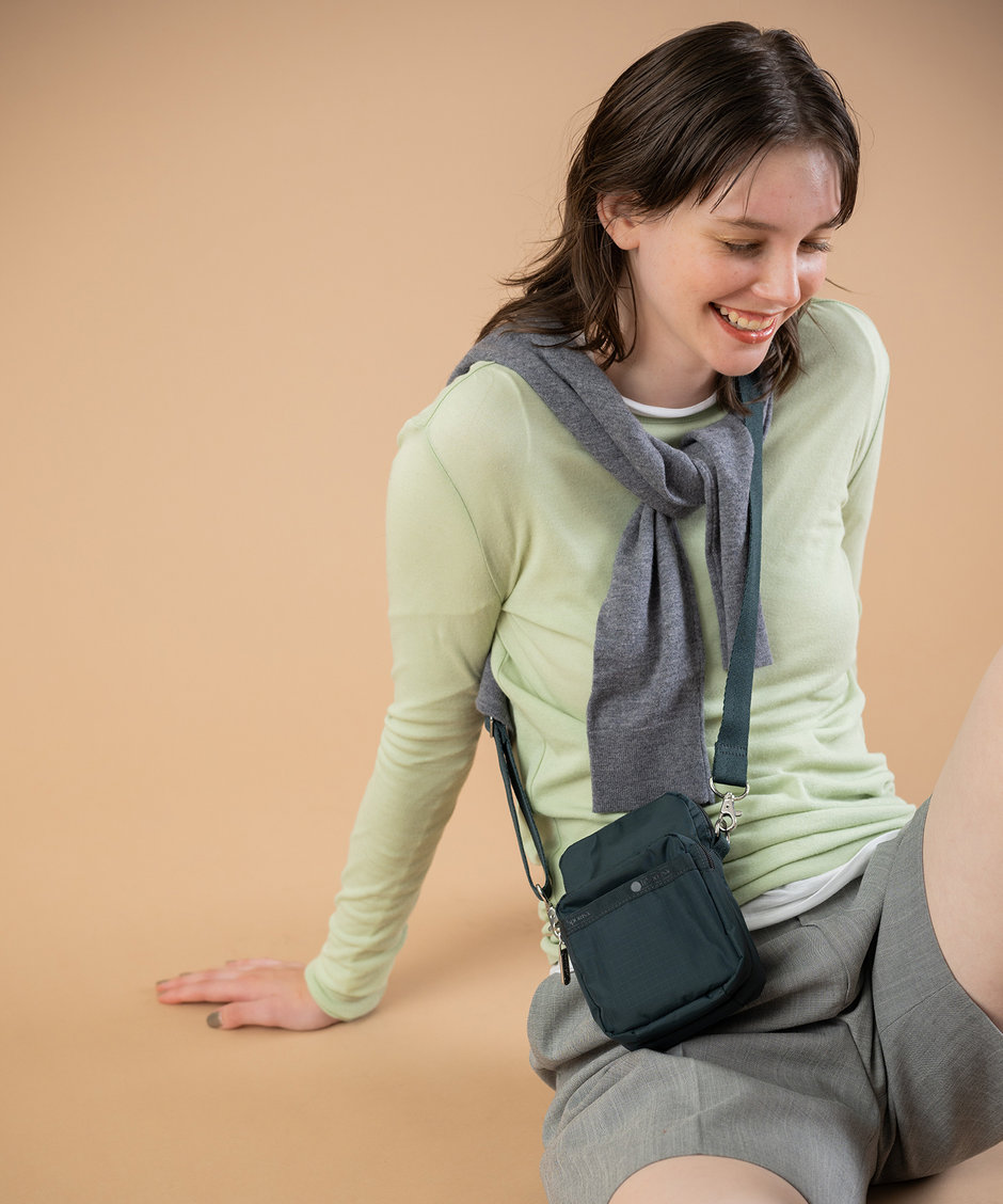ちょっとした近所のお出かけにも大活躍のフォンバッグ。フロントのマチ付きミニポケットにはリップやイヤフォンなど、すぐに取り出したいものを。