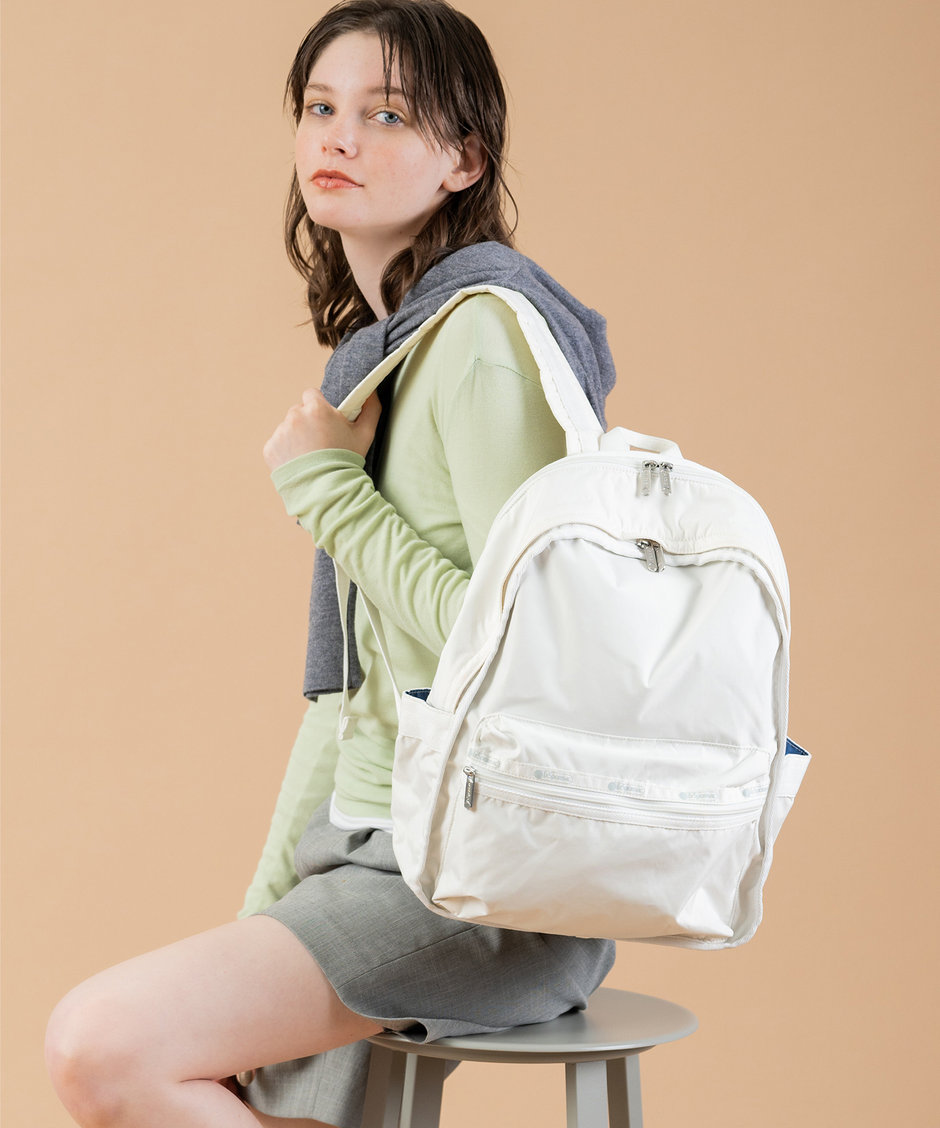 スタイリングを引き締めるクリーンな「メレンゲ」。PC収納もできるバックパックは通勤バッグにもおすすめです。