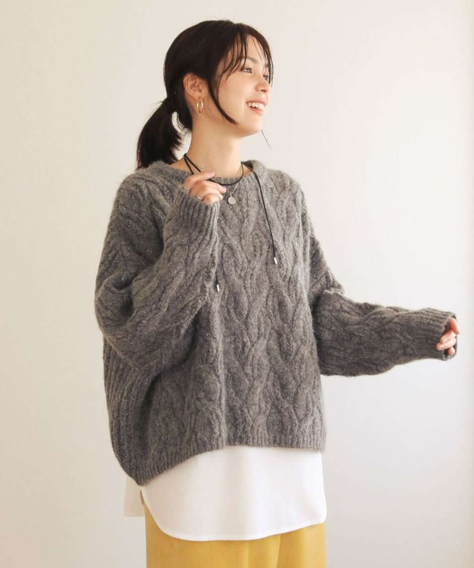 ふんわりとした起毛感のある糸で、カジュアルなケーブル編みも女性らしく柔らかい印象に。